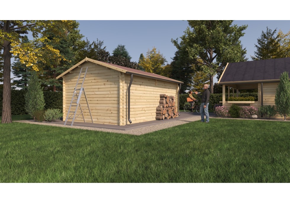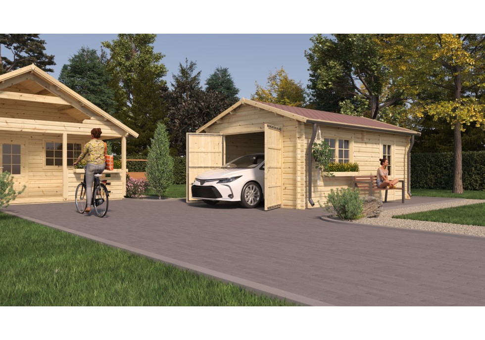 Garaż o wymiarach 3,9x5,7m to propozycja dla osób szukających solidnego miejsca do przechowywania pojazdów i narzędzi. Wykonany z wysokogatunkowego drewna nordic świerk o grubości ścian 44mm czynią go wyjątkowo trwałym i odpornym na codzienne użytkowanie. Wnętrze o powierzchni użytkowej 19,37m² zostało zaprojektowane z myślą o wygodzie – szerokie drzwi wjazdowe 2,40x2,06m ułatwiają dostęp, a dodatkowe boczne drzwi zwiększają funkcjonalność. Dach dwuspadowy o kącie nachylenia 19° chroni konstrukcję, a jednocześnie podkreśla klasyczny design garażu. Prosty, lecz elegancki wygląd sprawia, że garaż doskonale komponuje się z każdą przestrzenią. To praktyczne rozwiązanie, które spełni oczekiwania zarówno osób prywatnych, jak i użytkowników komercyjnych. Jego łatwy montaż i możliwość personalizacji czynią go jeszcze bardziej atrakcyjnym wyborem.