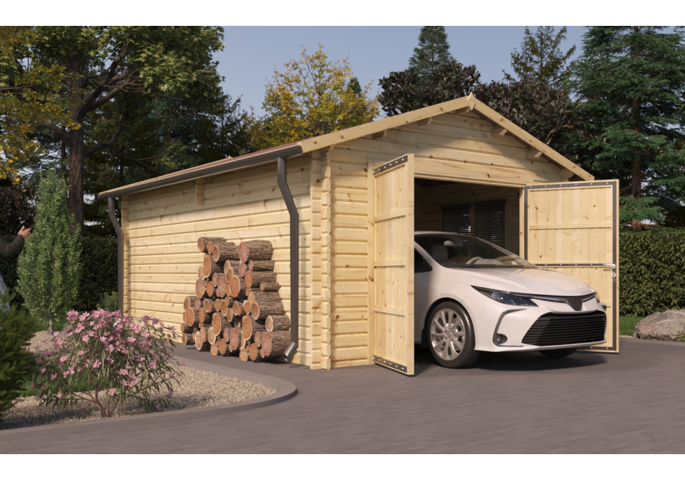 Wszechstronny drewniany garaż MONTREAL to idealny wybór dla osób szukających praktycznego i stylowego rozwiązania. Przestronne wnętrze pomieści nie tylko pojazdy, ale także narzędzia i sprzęt ogrodniczy. Garaż łatwo dopasujesz do swojej posesji, zapewniając ochronę i stylowy wygląd.