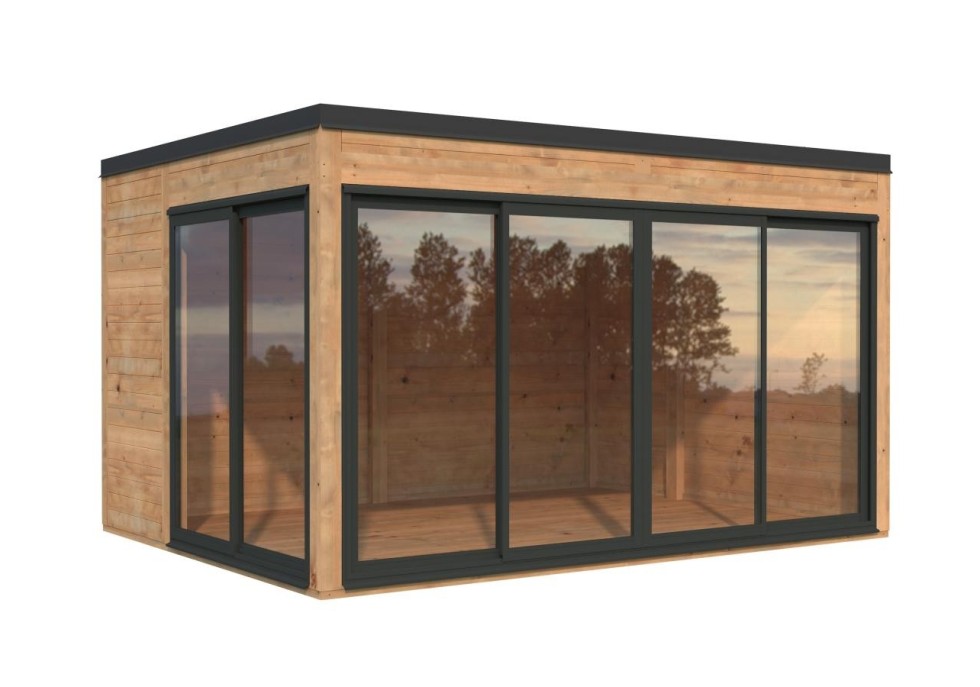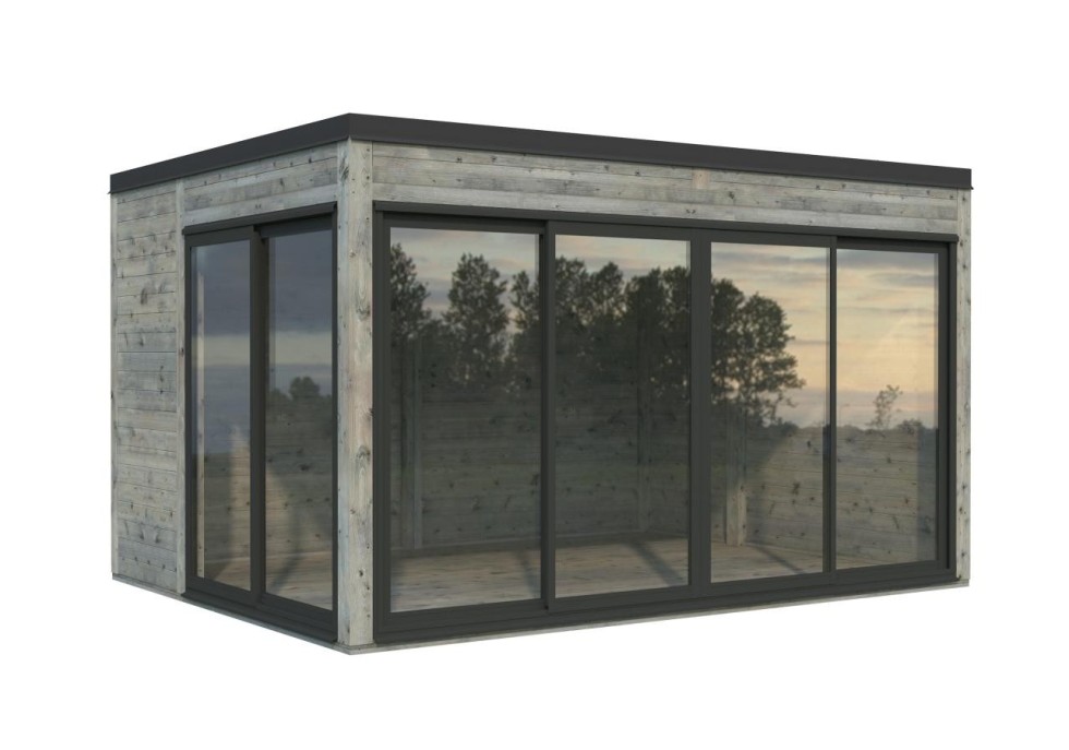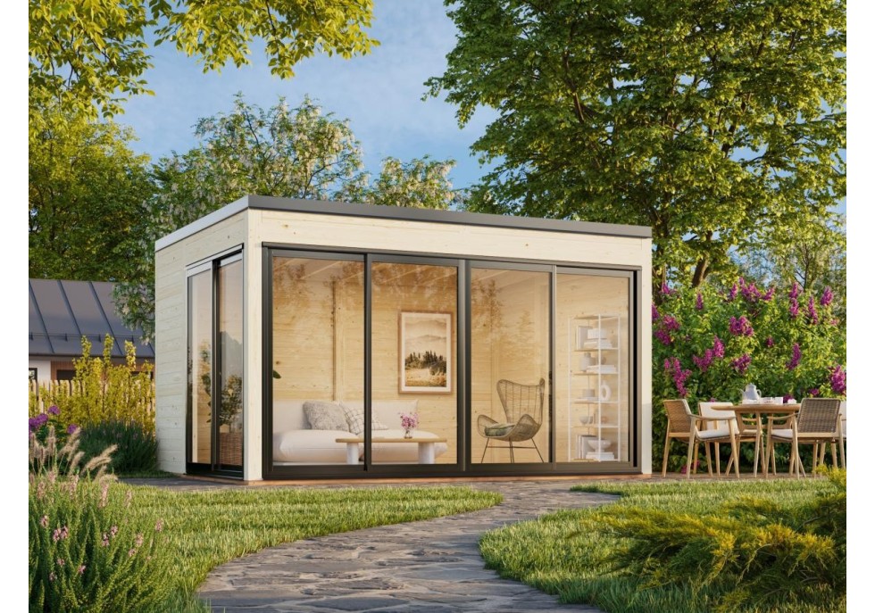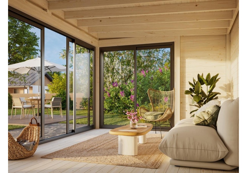 Altana nowoczesna Serena 126 zamknięta z drzwiami przesuwnymi z aluminium, to eleganckie połączenie minimalistycznej formy, funkcjonalności i bliskości natury. Przeszklone ściany zapewniają maksymalny dostęp światła dziennego oraz panoramiczny widok na ogród, jednocześnie chroniąc przed wiatrem i deszczem.