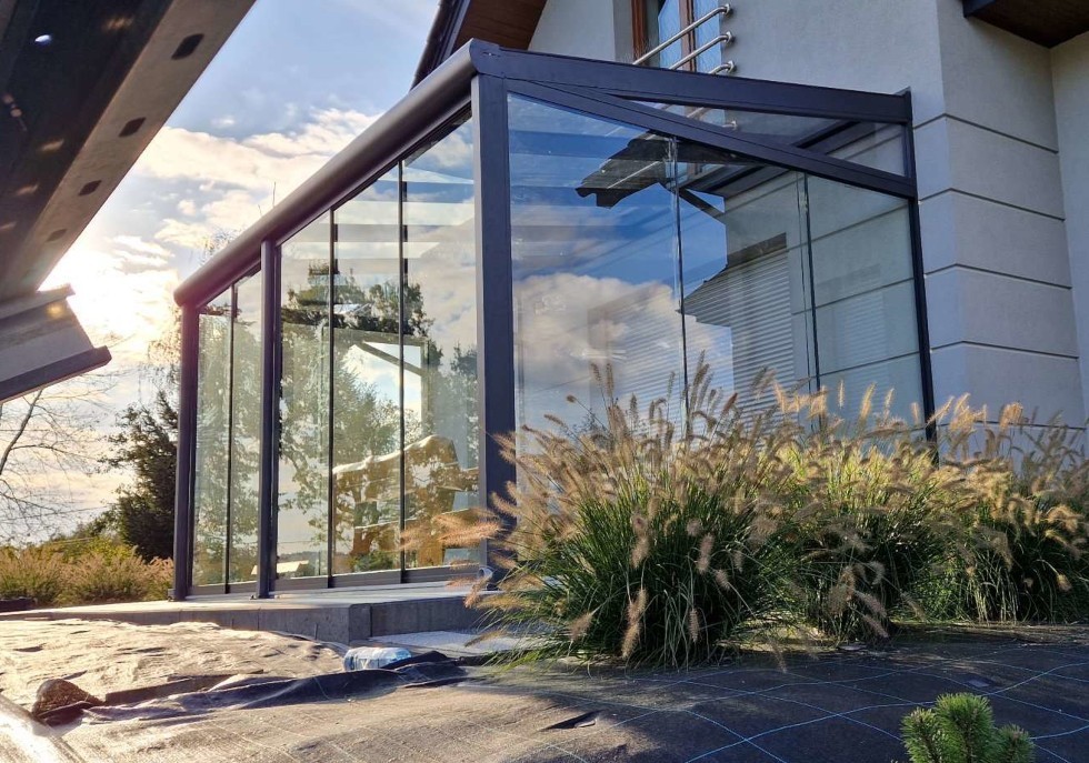 Ogród zimowy MODERN PRO — nowoczesna zabudowa tarasu z szybami przesuwnymi