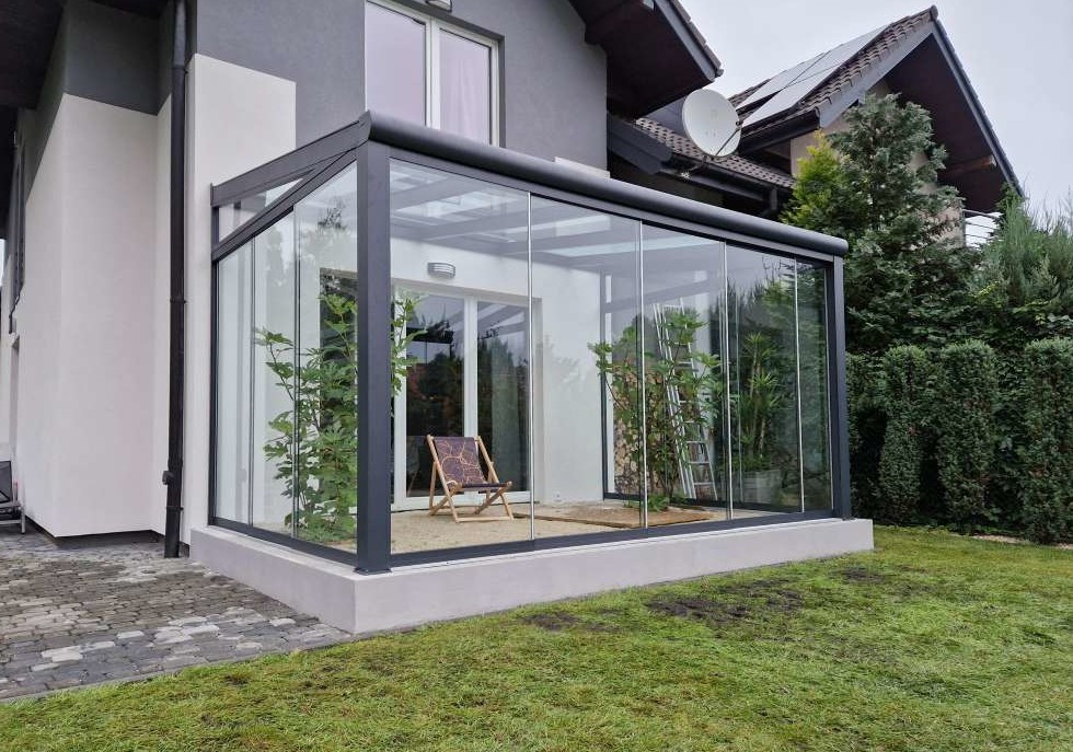 Ogród zimowy MODERN PRO — nowoczesna zabudowa tarasu z szybami przesuwnymi