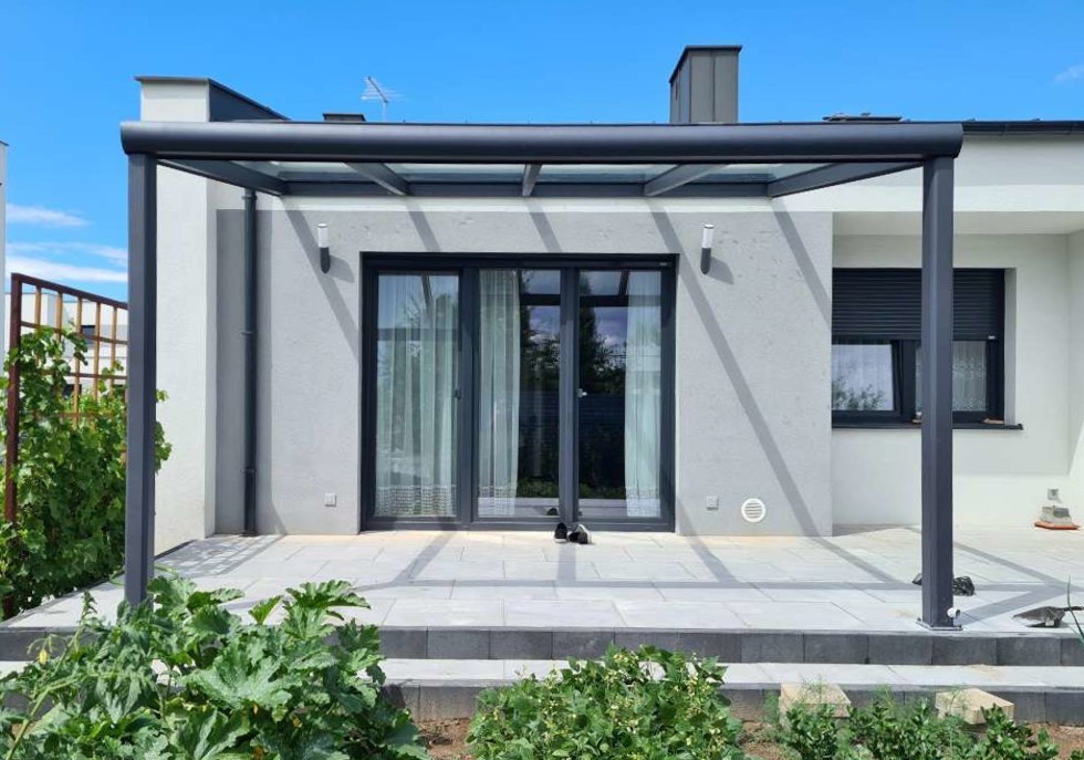 Nowoczesne zadaszenie tarasu, zaprojektowane z myślą o warunkach wiatrowych i śniegowych występujących w Polsce. Konstrukcja wykonana jest z wytrzymałych profili aluminiowych w kolorze antracyt (RAL7016), a dach stanowi szkło laminowane hartowane o grubości 9,14mm. Zyskujesz jasną, elegancką przestrzeń na tarasie — z możliwością rozbudowy o system przesuwnych przeszkleń, tworząc pełnoprawny ogród zimowy.