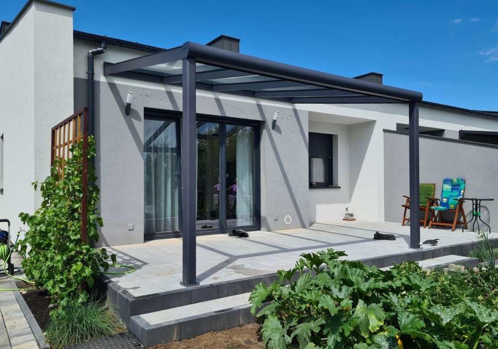 Nowoczesne zadaszenie tarasu, zaprojektowane z myślą o warunkach wiatrowych i śniegowych występujących w Polsce. Konstrukcja wykonana jest z wytrzymałych profili aluminiowych w kolorze antracyt (RAL7016), a dach stanowi szkło laminowane hartowane o grubości 9,14mm. Zyskujesz jasną, elegancką przestrzeń na tarasie — z możliwością rozbudowy o system przesuwnych przeszkleń, tworząc pełnoprawny ogród zimowy.